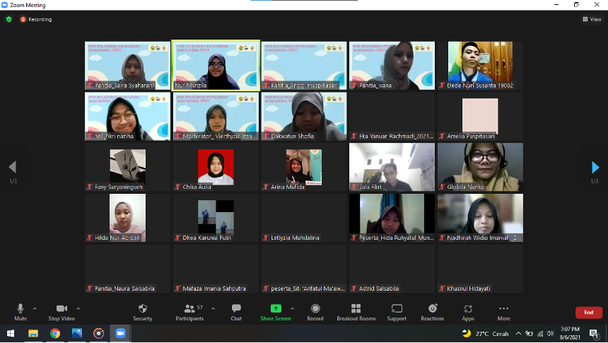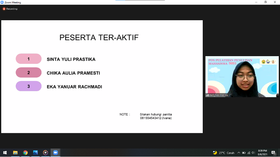 Peserta kegiatan Pos Penalaran dan Penulisan Mahasiswa (P3M) adalah mahasiswa Fakultas Kesehatan Masyarakat Universitas Jember yang tergabung dalam Unit Kegiatan Mahasiswa Lingkar Penelitian dan Penalaran (LENTERA) FKM Universitas Jember pada tahun 2020 dan beberapa mahasiswa 2019 dengan total peserta sebanyak 46 mahasiswa. Kegiatan ini dilaksanakan 1-2 kali dalam 1 bulan, diawali dengan techinal meeting dan pembukaan acara pada Sabtu, 27 Maret 2021 untuk menentukan kesepakatan jadwal pertemuan selanjutnya. Pembukaan pertemuan pertama ini dihadiri oleh Ibu Dr. Farida Wahyuningtyas, S.KM., M.Kes. selaku Dekan Fakultas Kesehatan Masyarakat Universitas Jember.