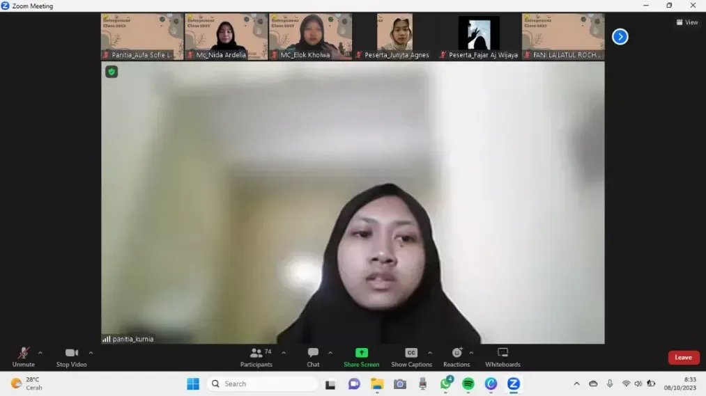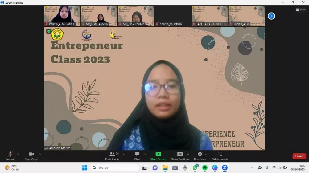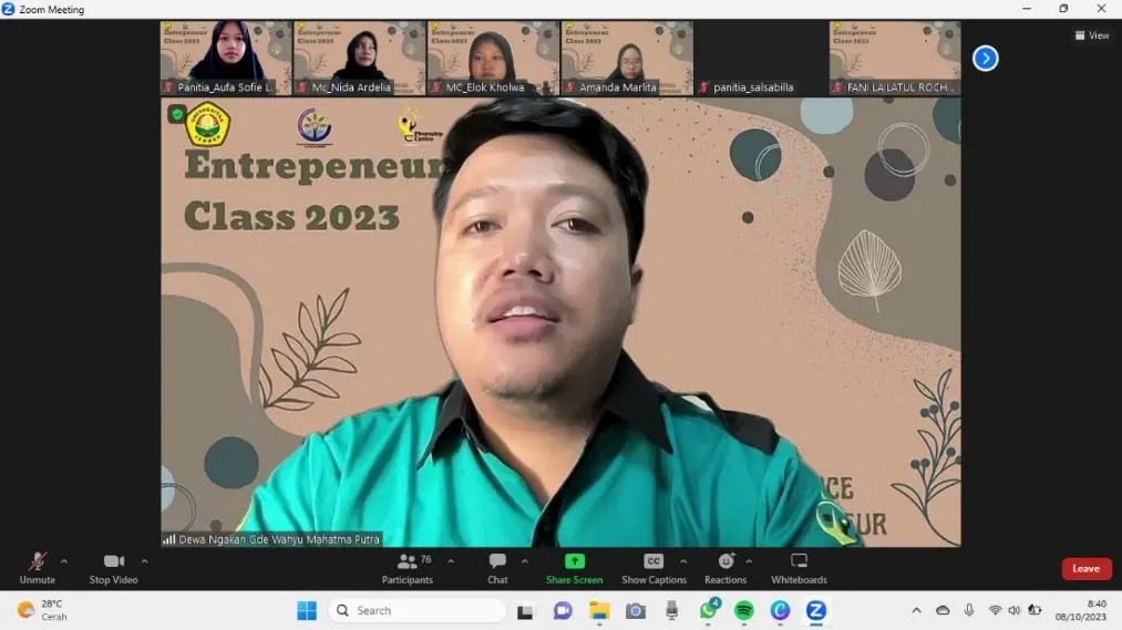 Kegiatan webinar Entrepreneur Class 2023 oleh UKM Phrenship Centre dilaksanakan secara daring melalui zoom meeting. Kegiatan dilaksanakan pada tanggal 8 Oktober 2023 dengan mengangkat tema “Start Your Experience to Be a Great Entrepreneur”. Kegiatan ini diisi oleh 2 pemateri yaitu saudara Fikri Ahmad Mudhaffar, C.PS selaku founder Sasana Muda Indonesia serta owner EsTe Snack Bondowoso dan saudari Nofia Lestari, S.KM selaku owner Seblak Diacken, conten creator, dan beauty influencer.