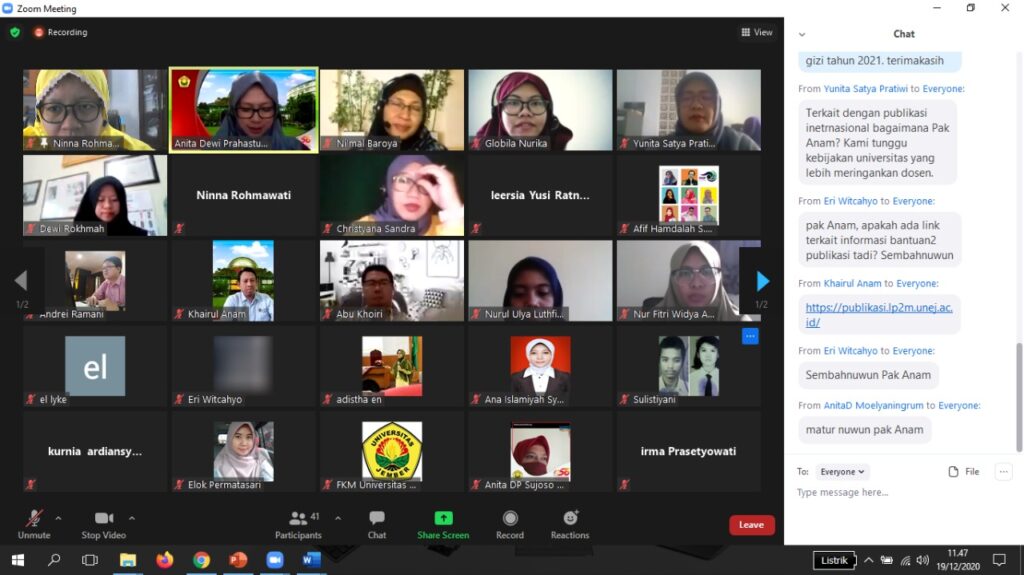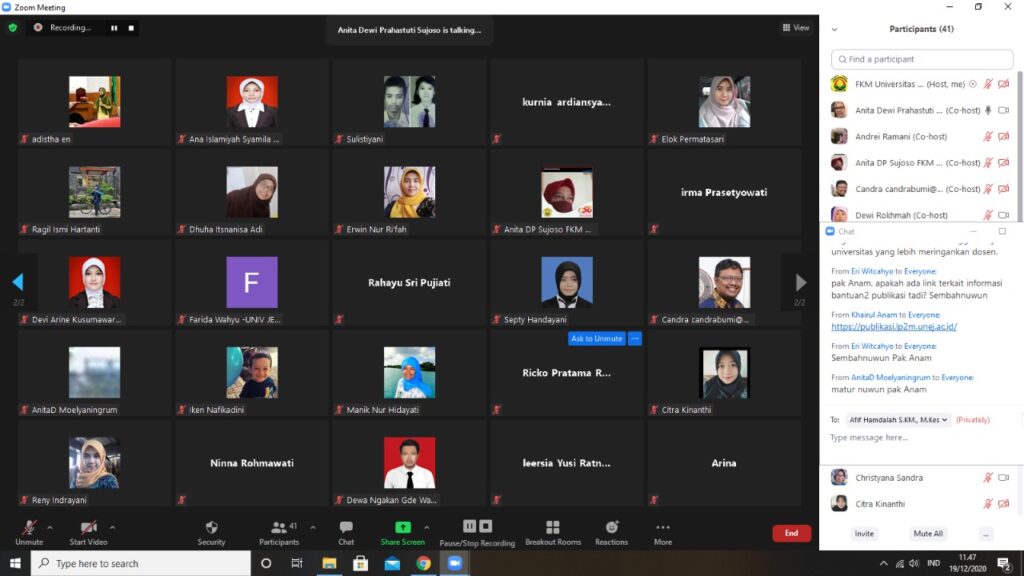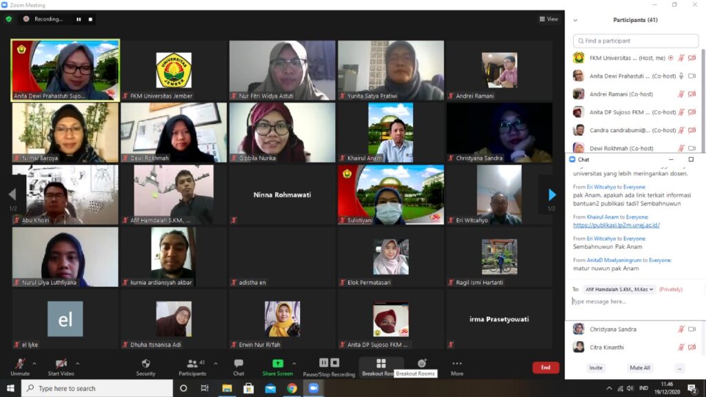 Riset adalah salah satu kegiatan utama dosen dalam pengembangan sebuah ilmu pengetahuan. Keberadaan kelompok riset (KeRis) merupakan wadah bagi dosen untuk mengembangkan pengetahuan, keilmuan dan memajukan peradaban masyarakat. Kelompok riset terdiri dari dosen-dosen yang memiliki minat yang sama terhadap satu kajian tertentu. Fakultas Kesehatan Masyarakat Universitas Jember telah berdiri 10 kelompok riset, baik keris peminatan di tingkat program studi maupun keris di tingkat fakultas. Melalui kegiatan yang dilakukan oleh kelompok riset ini baik penelitian atau pengabdian masyarakat akan tercipta suasana akademik yang akan menhasilkan karya-karya ilmiah yang menyertainya, misal seperti jurnal internasional bereputasi, jurnal nasional terakreditasi, buku ajar, buku teks atau kegiatan ilmiah lainnya misal seminar atau workshop dan luaran lainnya.